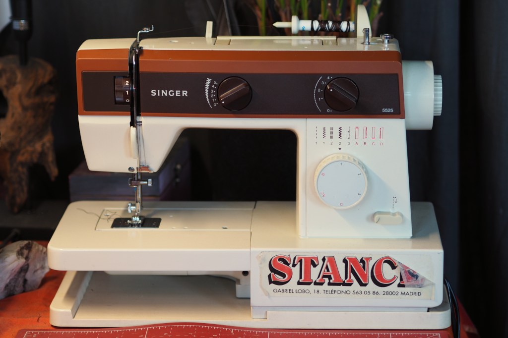 Meine Singer 5525. Für lange Zeit dachte ich, dass diese Nähmaschine ein Erbstück von meiner Oma wäre, aber anscheinend hat meine Mutter sie einmal gekauft. Damit ist sie zwar „nur“ eine Generation alt, aber immerhin wanderte ihr schwerer Metallkorpus auch schon durch die Hände meiner älteren Schwester. Davon zeugt der Sticker, der noch heute die Vorderseite der Maschine ziert.