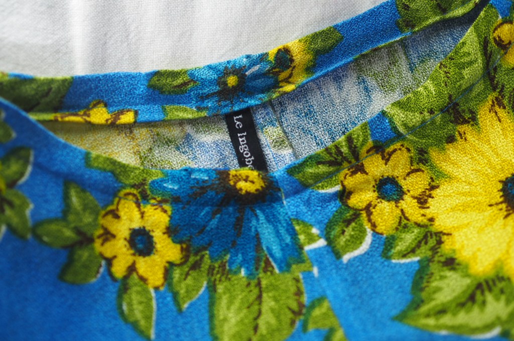 Dieser Stoff war also eigentlich nur zum Ausprobieren gedacht. Dabei ist er an und für sich wirklich schön. Ein leuchtendes Blumenmuster, das einem Vintage- oder vielleicht auch Ukraine-Vibes vermittelt. Ich habe ihn bei einem second-hand Lagerverkauf in Leipzig gefunden. Der Test mit dem Feuerzeug legt nahe, dass es sich um Baumwolle handelt.2 Die Oberfläche hat eine gut sichtbare Textur. Sie sieht fast körnig aus, ist aber keineswegs unangenehm. Der Stoff fällt sehr leicht, ist sehr flexibel, aber nicht dehnbar.