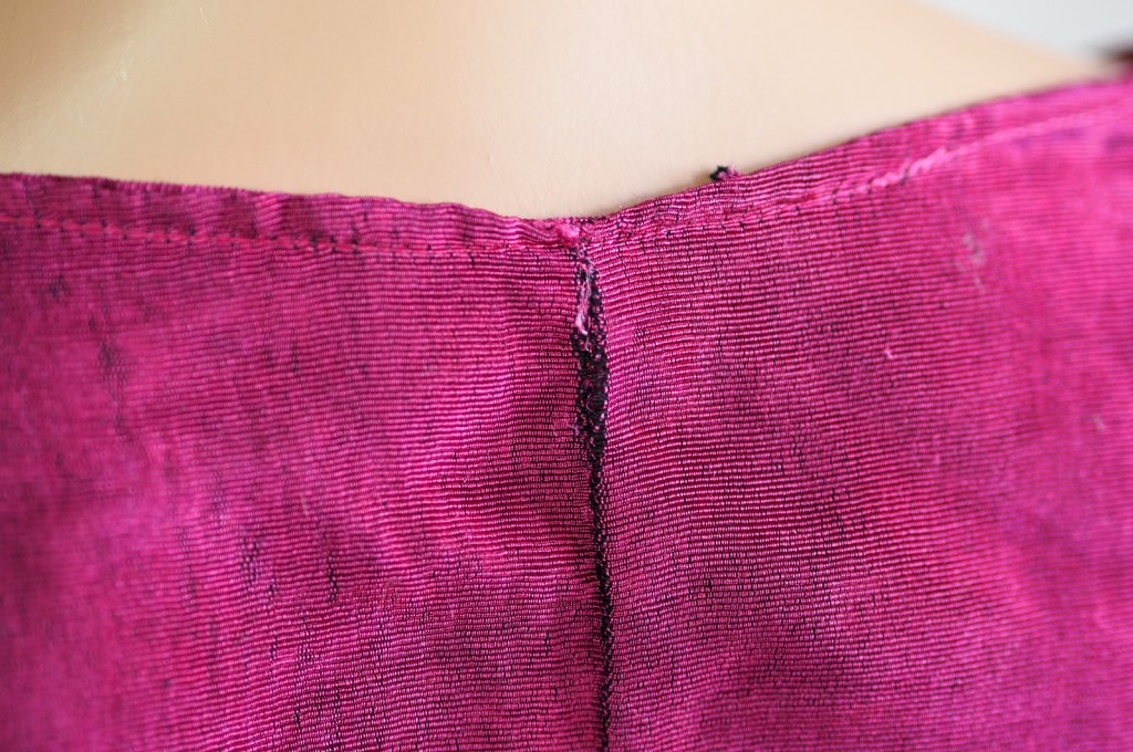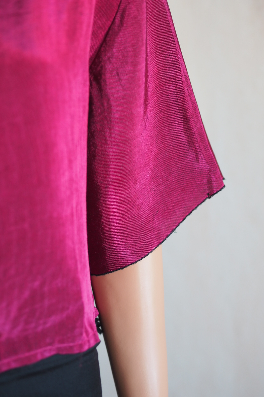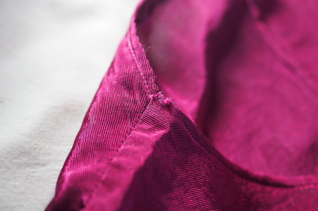 Die hier gezeigten Bilder sind erst vor wenigen Wochen entstanden. Sie zeigen also nicht, wie das Stück vor zwei Jahren bei seiner Fertigstellung ausgesehen hat, sondern wie es heute aussieht. Dieser Blick ist etwas ernüchternd, auf lange Sicht aber vor allem lehrreich für mich. Er führt mir vor Augen, wie ich vor knapp zwei Jahren noch genäht habe. Ich sehe an den Nähten und Säumen einiges, was ich heute sauberer und genauer machen würde. Rückblickend habe ich das Gefühl, dass ich damals ungeduldig beim Nähen war. Ich habe mir beispielsweise nicht die Mühe gemacht einen ordentlichen Saum zu nähen. An den Enden der Ärmel befindet sich einfach die Webkante des Stoffes.