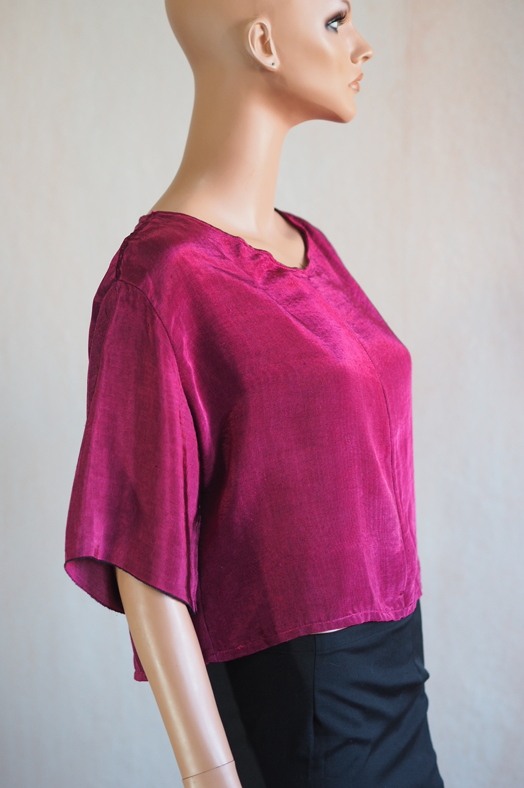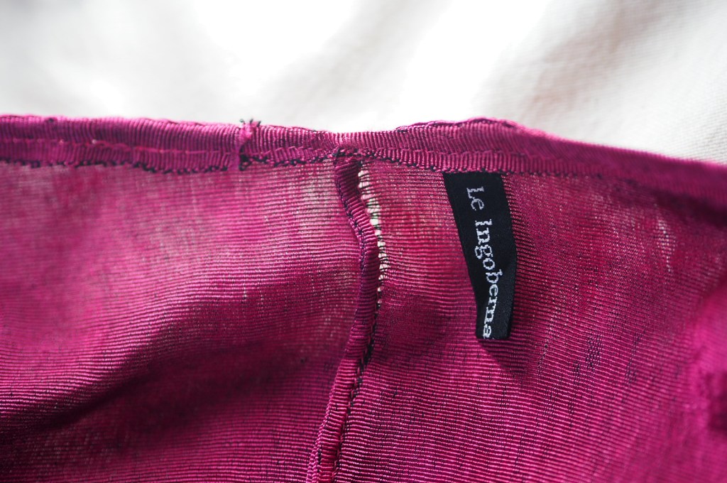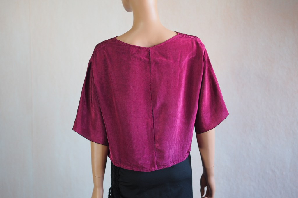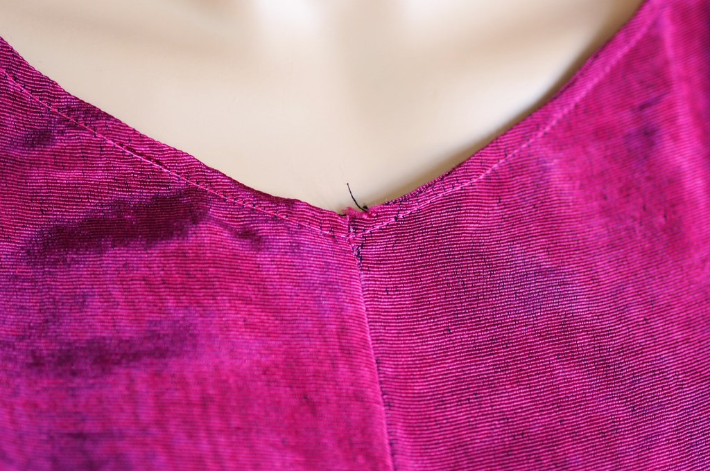 Hinsichtlich der Entwicklung meiner Fähigkeiten kann ich also zufrieden sein. Woher kommt dann die Ernüchterung? Erstens: Der Stoff hat von seinem magischen Glanz einiges eingebüßt. Es scheint, als gehe dieser beim Waschen verloren. Ich habe das Oberteil zwar nicht oft getragen und wohl noch seltener gewaschen, ich schätze so höchstens sechs bis acht mal und auch nur mit Feinwaschmittel, aber dennoch: Im Vergleich zu meinen noch ungewaschenen Stoffresten ist der Unterschied sehr deutlich. Auch wenn der Stoff weiterhin schön ist und die Wellen noch in Ansätzen erkennbar sind.